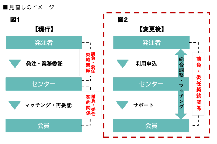 新しい契約方法では、発注者様と会員との間に直接的な契約関係が生じるようになります。センターは発注者様と会員の間に入りさまざまな調整を行います。